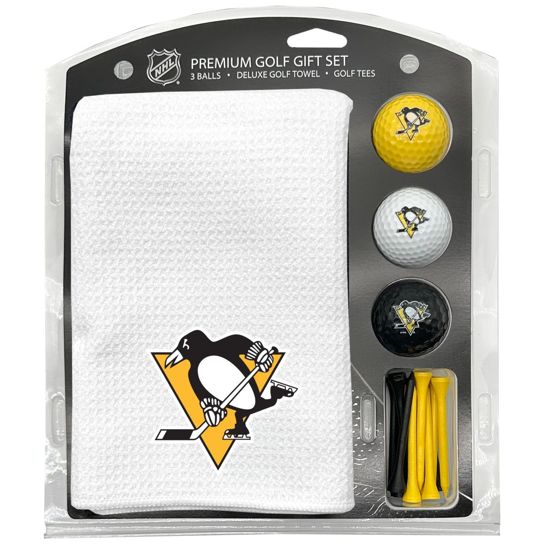 Pittsburgh Penguins Microfiber Towel Gift Set - 16 x 40 (White) 16” x 40” printed logo towel, 3 different color golf balls, 12 golf tees, High quality digital print