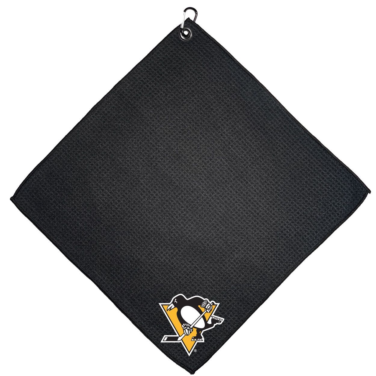 Pittsburgh Penguins Microfiber Towel - 15" x 15" (Colored) Carabiner attached, Measures approx. 15" x 15", Cleans without scratching club surface, Printed graphics, Material: 85% Polyester/15% Polyamide, Woven waffle fabric, Machine wash, tumble dry low, Officially licensed