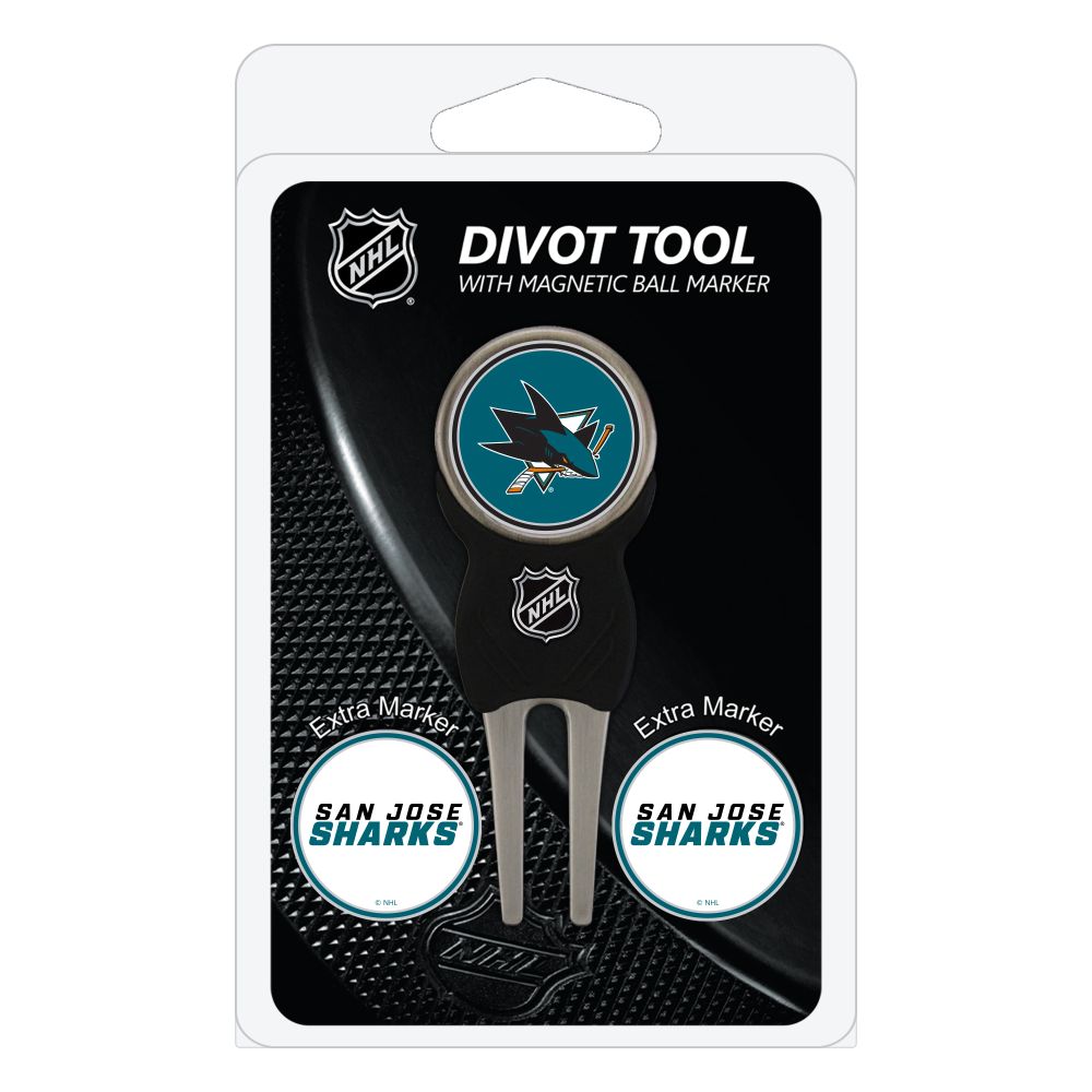 San Jose Sharks Divot Tool Pack - Signature tool w/ 3 markers Add some team pride to your game on the green with the Team Golf? Divot Tool and Marker Set. This set includes three double-sided, enamel magnetic markers that feature the team logo and wordmark and a nickel-finished divot tool with the team logo. The magnetic markers are easily removed from and reattach to the divot tool, making it easy to mark your ball. Support your team with this team-inspired set.