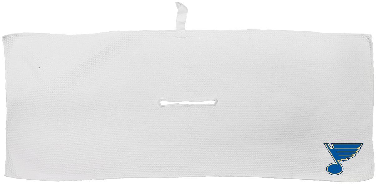 St. Louis Blues Large Microfiber Towel - 16" x 40" (White) Carabiner attachment system, Measures approx. 16'' x 40'', Sublimated graphics, Center slit measures approx. 6" in diameter, Fabric loop, Material: 85% Polyester/15% Polyamide, Machine wash, tumble dry low, Officially licensed
