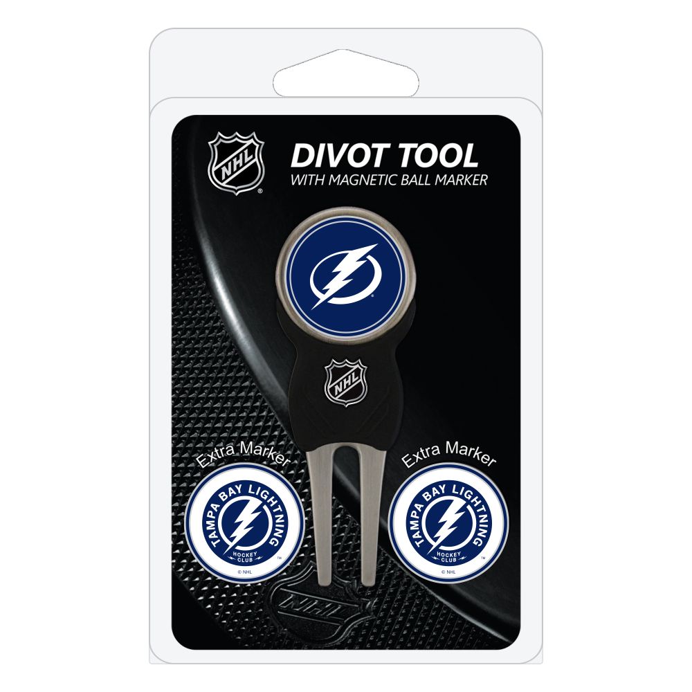Tampa Bay Lightning Divot Tool Pack - Signature tool w/ 3 markers Add some team pride to your game on the green with the Team Golf? Divot Tool and Marker Set. This set includes three double-sided, enamel magnetic markers that feature the team logo and wordmark and a nickel-finished divot tool with the team logo. The magnetic markers are easily removed from and reattach to the divot tool, making it easy to mark your ball. Support your team with this team-inspired set.