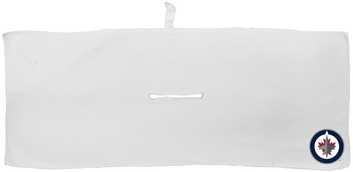 Winnipeg Jets Large Microfiber Towel - 16" x 40" (White) Carabiner attachment system, Measures approx. 16'' x 40'', Sublimated graphics, Center slit measures approx. 6" in diameter, Fabric loop, Material: 85% Polyester/15% Polyamide, Machine wash, tumble dry low, Officially licensed