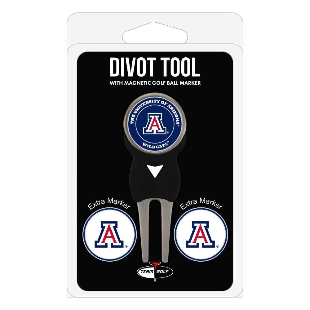 Arizona Wildcats Divot Tool Pack - Signature tool w/ 3 markers Add some team pride to your game on the green with the Team Golf? Divot Tool and Marker Set. This set includes three double-sided, enamel magnetic markers that feature the team logo and wordmark and a nickel-finished divot tool with the team logo. The magnetic markers are easily removed from and reattach to the divot tool, making it easy to mark your ball. Support your team with this team-inspired set.