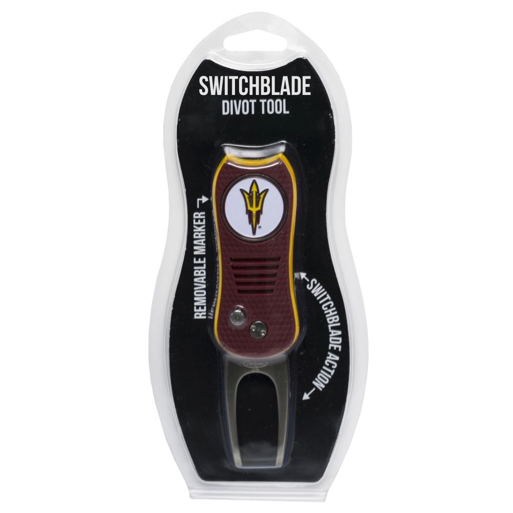 Arizona State Sun Devils Switchblade Divot Tool Pack Ball marker measures approx. 1'' in diameter, Divot tool measures approx. 2.8'' in height when closed; 4.5'' when open, Printed graphics with enamel overlay, Soft-touch rubberized grip, Switchblade function with button release, Magnetic ball marker, Material: 100% Plastic - Base; 100% Metal - Divot Tool & Marker