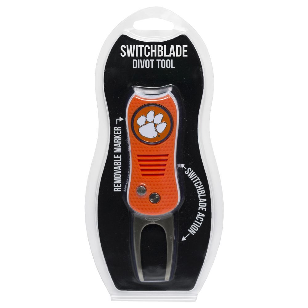 Clemson Tigers Switchblade Divot Tool Pack Ball marker measures approx. 1'' in diameter, Divot tool measures approx. 2.8'' in height when closed; 4.5'' when open, Printed graphics with enamel overlay, Soft-touch rubberized grip, Switchblade function with button release, Magnetic ball marker, Material: 100% Plastic - Base; 100% Metal - Divot Tool & Marker