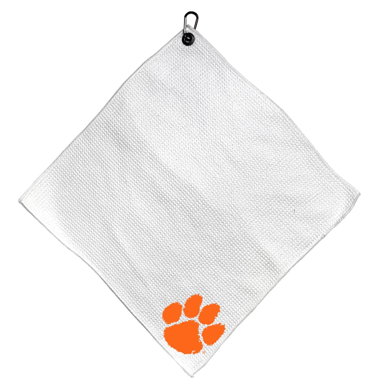 Clemson Tigers Microfiber Small Towel - 15" x 15" (White) Carabiner attached, Measures approx. 15" x 15", Cleans without scratching club surface, Printed graphics, Material: 85% Polyester/15% Polyamide, Woven waffle fabric, Machine wash, tumble dry low, Officially licensed