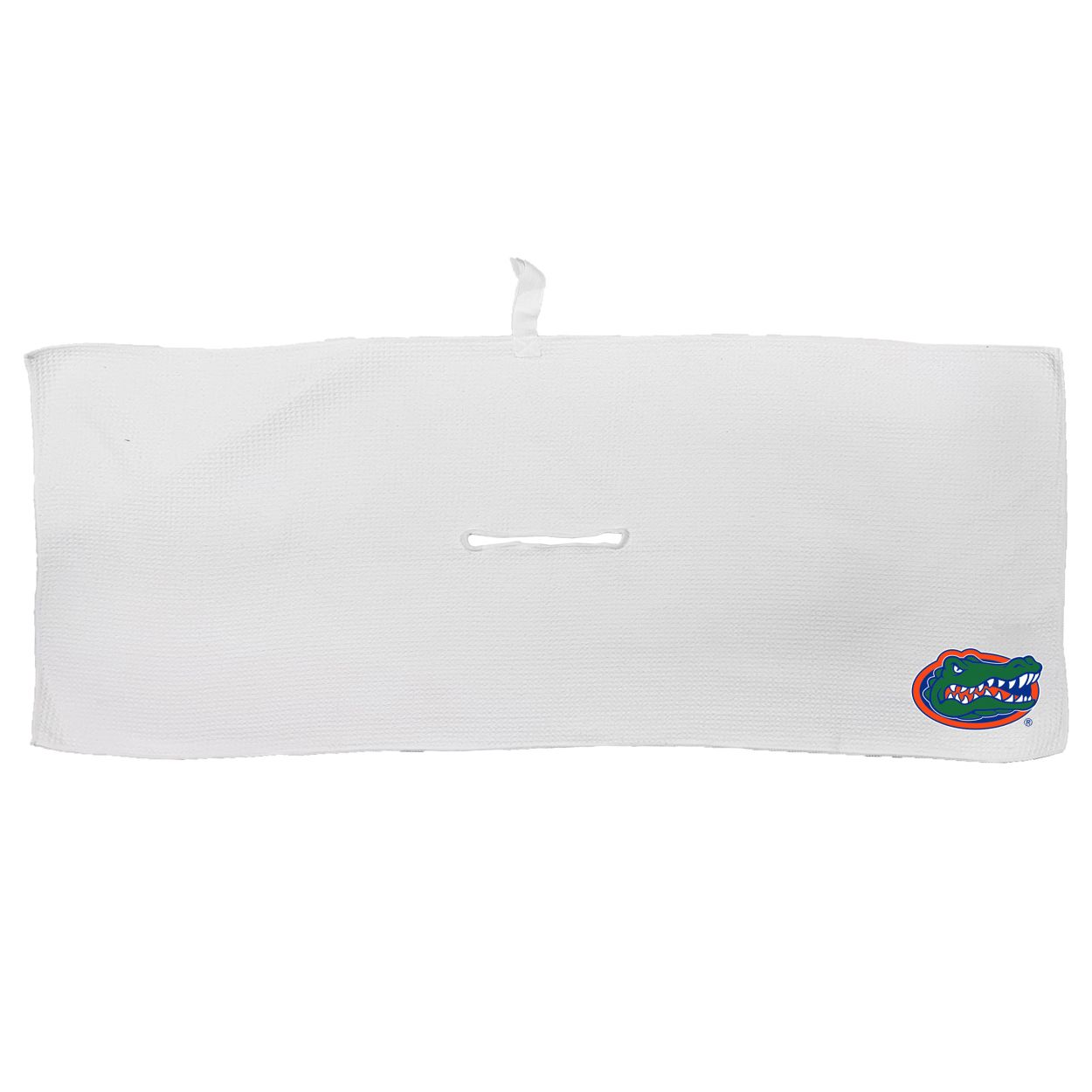 Florida Gators Large Microfiber Towel - 16" x 40" (White) Carabiner attachment system, Measures approx. 16'' x 40'', Sublimated graphics, Center slit measures approx. 6" in diameter, Fabric loop, Material: 85% Polyester/15% Polyamide, Machine wash, tumble dry low, Officially licensed