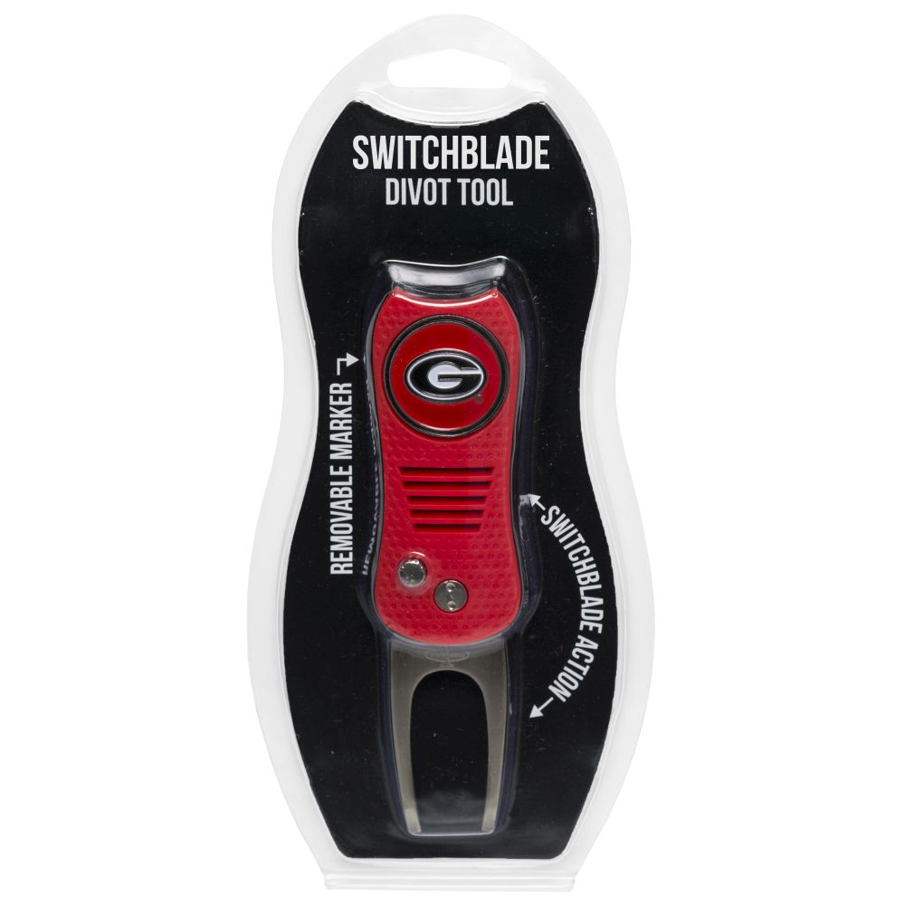 Georgia Bulldogs Switchblade Divot Tool Pack Ball marker measures approx. 1'' in diameter, Divot tool measures approx. 2.8'' in height when closed; 4.5'' when open, Printed graphics with enamel overlay, Soft-touch rubberized grip, Switchblade function with button release, Magnetic ball marker, Material: 100% Plastic - Base; 100% Metal - Divot Tool & Marker
