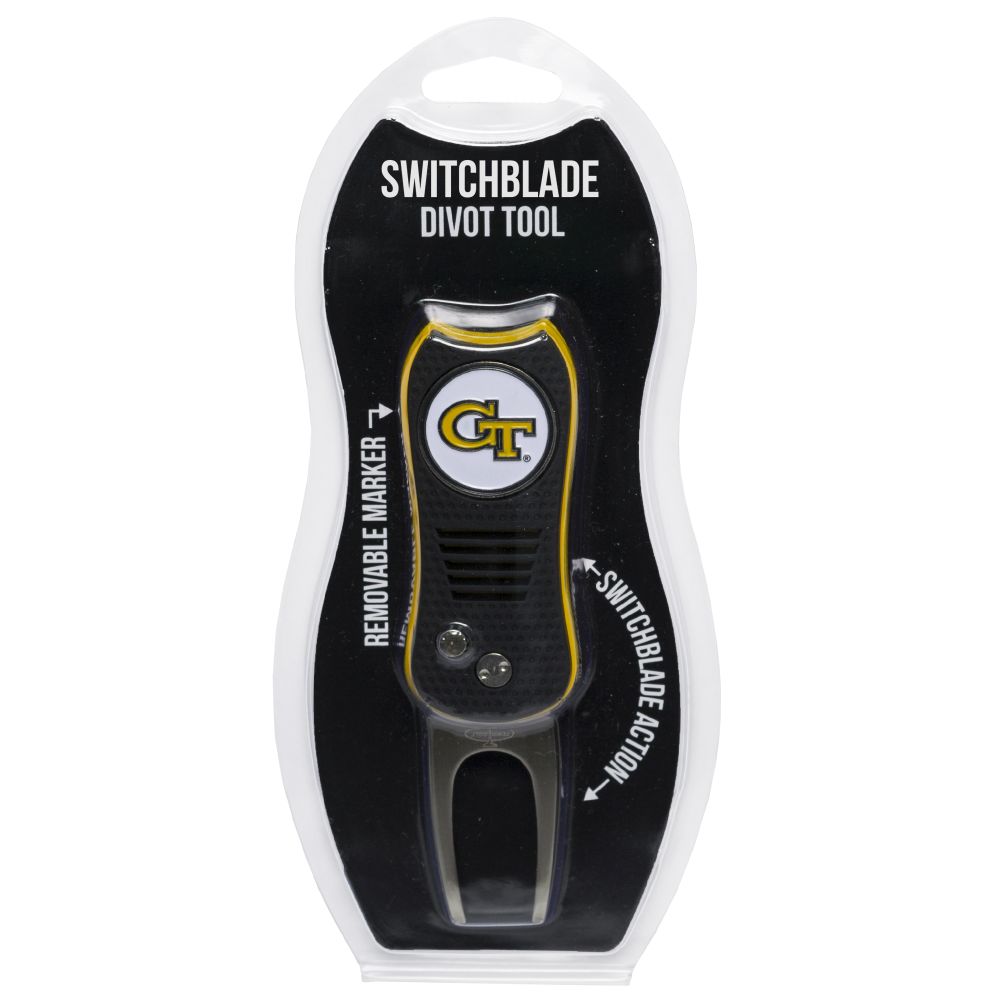 Georgia Tech Yellow Jackets Switchblade Divot Tool Pack Ball marker measures approx. 1'' in diameter, Divot tool measures approx. 2.8'' in height when closed; 4.5'' when open, Printed graphics with enamel overlay, Soft-touch rubberized grip, Switchblade function with button release, Magnetic ball marker, Material: 100% Plastic - Base; 100% Metal - Divot Tool & Marker
