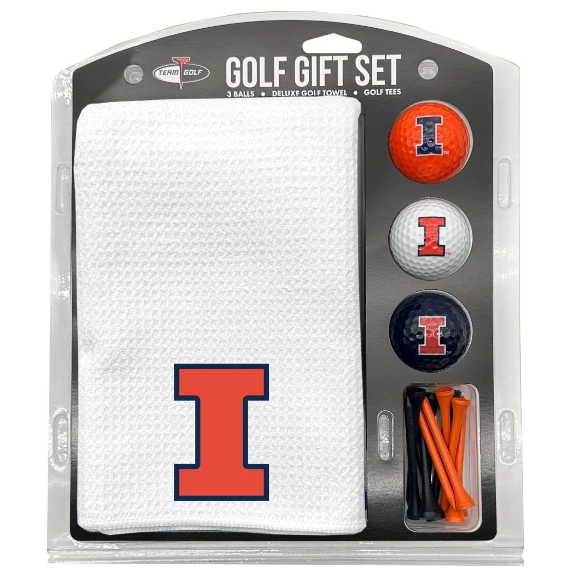 Illinois Fighting Illini Microfiber Towel Gift Set - 16 x 40 (White) 16” x 40” printed logo towel, 3 different color golf balls, 12 golf tees, High quality digital print