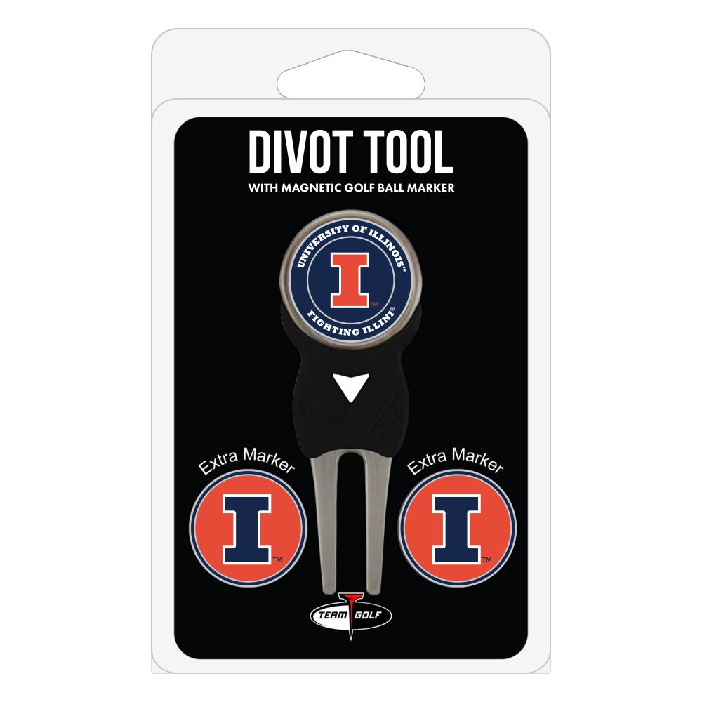 Illinois Fighting Illini Divot Tool Pack - Signature tool w/ 3 markers Add some team pride to your game on the green with the Team Golf? Divot Tool and Marker Set. This set includes three double-sided, enamel magnetic markers that feature the team logo and wordmark and a nickel-finished divot tool with the team logo. The magnetic markers are easily removed from and reattach to the divot tool, making it easy to mark your ball. Support your team with this team-inspired set.