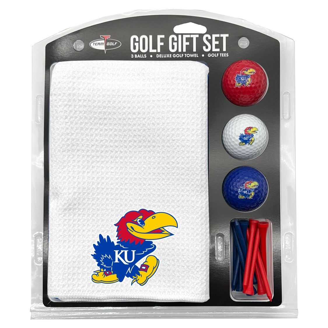 Kansas Jayhawks Microfiber Towel Gift Set - 16 x 40 (White) 16” x 40” printed logo towel, 3 different color golf balls, 12 golf tees, High quality digital print
