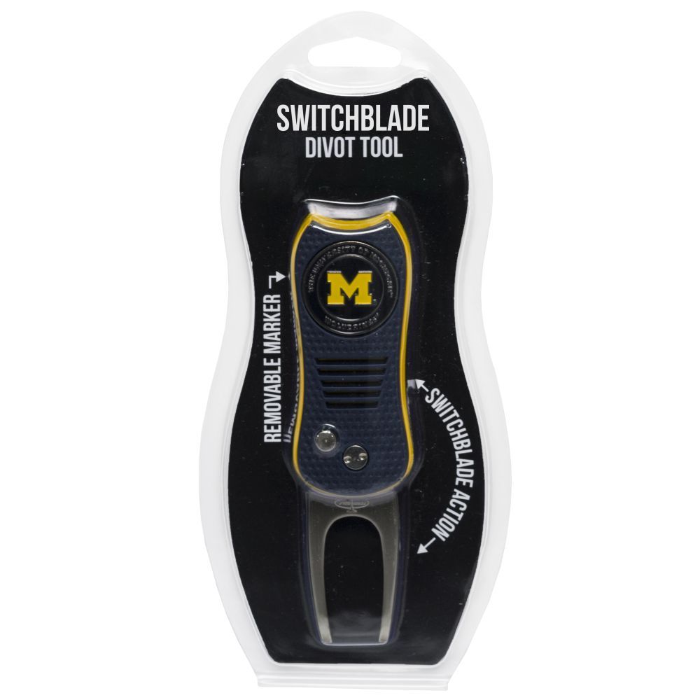 Michigan Wolverines Switchblade Divot Tool Pack Ball marker measures approx. 1'' in diameter, Divot tool measures approx. 2.8'' in height when closed; 4.5'' when open, Printed graphics with enamel overlay, Soft-touch rubberized grip, Switchblade function with button release, Magnetic ball marker, Material: 100% Plastic - Base; 100% Metal - Divot Tool & Marker