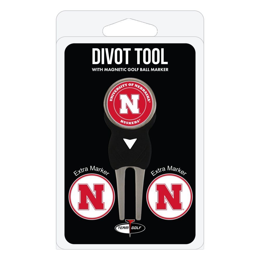 Nebraska Cornhuskers Divot Tool Pack - Signature tool w/ 3 markers Add some team pride to your game on the green with the Team Golf? Divot Tool and Marker Set. This set includes three double-sided, enamel magnetic markers that feature the team logo and wordmark and a nickel-finished divot tool with the team logo. The magnetic markers are easily removed from and reattach to the divot tool, making it easy to mark your ball. Support your team with this team-inspired set.