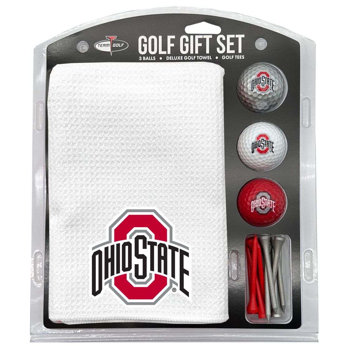 Ohio State Buckeyes Microfiber Towel Gift Set - 16 x 40 (White) 16” x 40” printed logo towel, 3 different color golf balls, 12 golf tees, High quality digital print