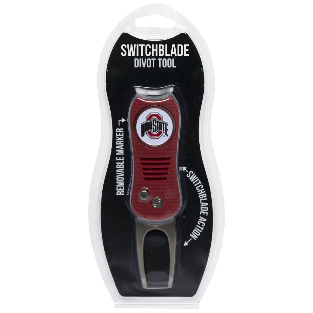 Ohio State Buckeyes Switchblade Divot Tool Pack Ball marker measures approx. 1'' in diameter, Divot tool measures approx. 2.8'' in height when closed; 4.5'' when open, Printed graphics with enamel overlay, Soft-touch rubberized grip, Switchblade function with button release, Magnetic ball marker, Material: 100% Plastic - Base; 100% Metal - Divot Tool & Marker