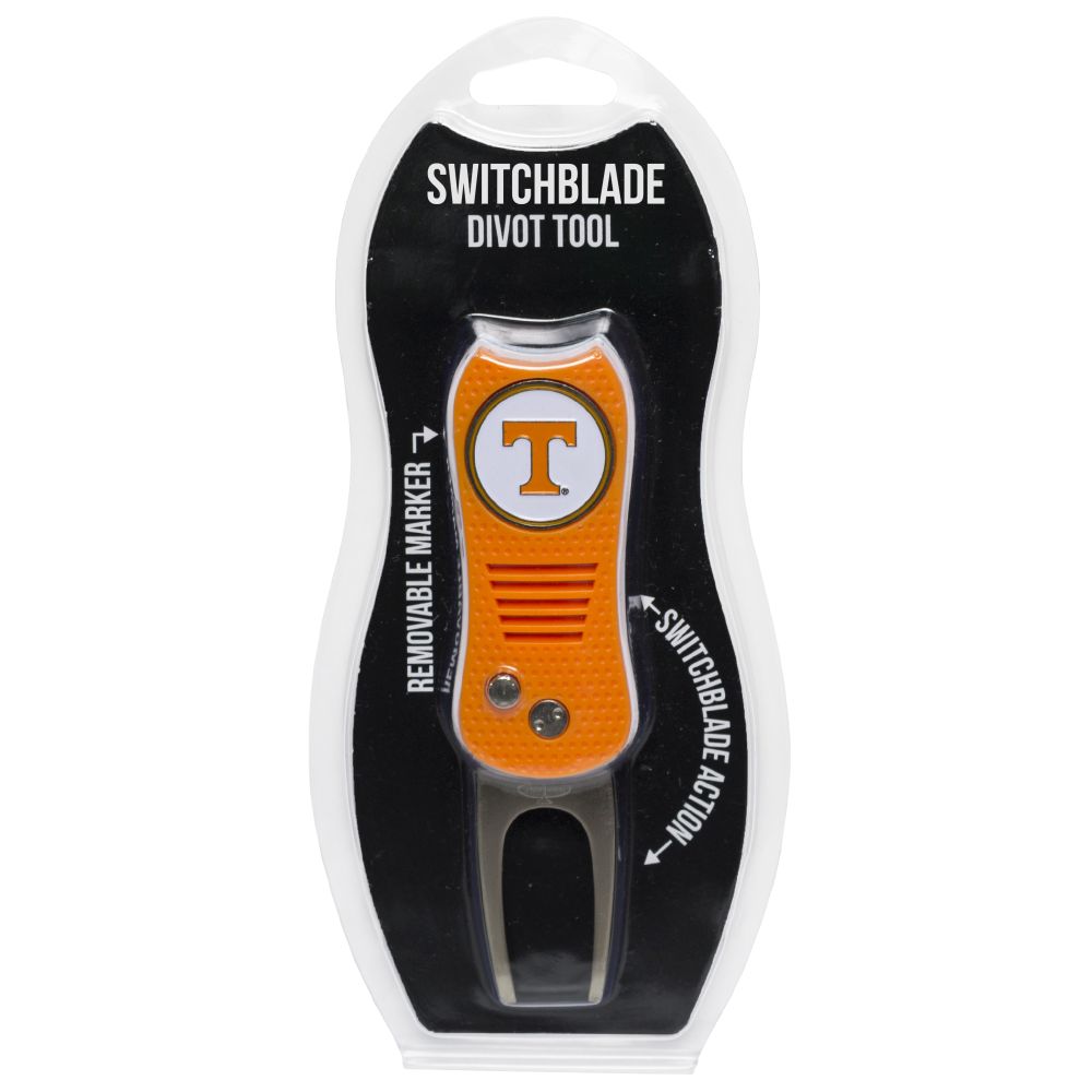 Tennessee Volunteers Switchblade Divot Tool Pack Ball marker measures approx. 1'' in diameter, Divot tool measures approx. 2.8'' in height when closed; 4.5'' when open, Printed graphics with enamel overlay, Soft-touch rubberized grip, Switchblade function with button release, Magnetic ball marker, Material: 100% Plastic - Base; 100% Metal - Divot Tool & Marker
