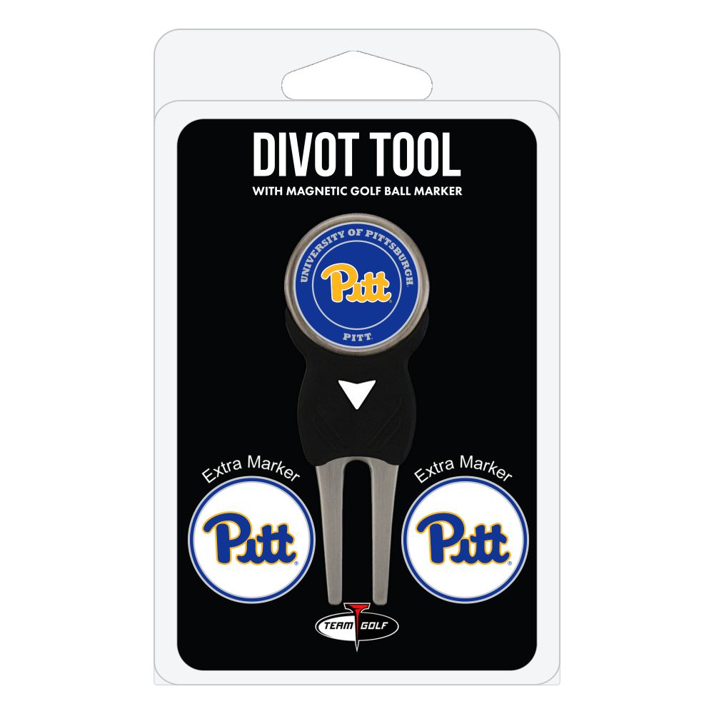 Pittsburgh Panthers Divot Tool Pack - Signature tool w/ 3 markers Add some team pride to your game on the green with the Team Golf? Divot Tool and Marker Set. This set includes three double-sided, enamel magnetic markers that feature the team logo and wordmark and a nickel-finished divot tool with the team logo. The magnetic markers are easily removed from and reattach to the divot tool, making it easy to mark your ball. Support your team with this team-inspired set.