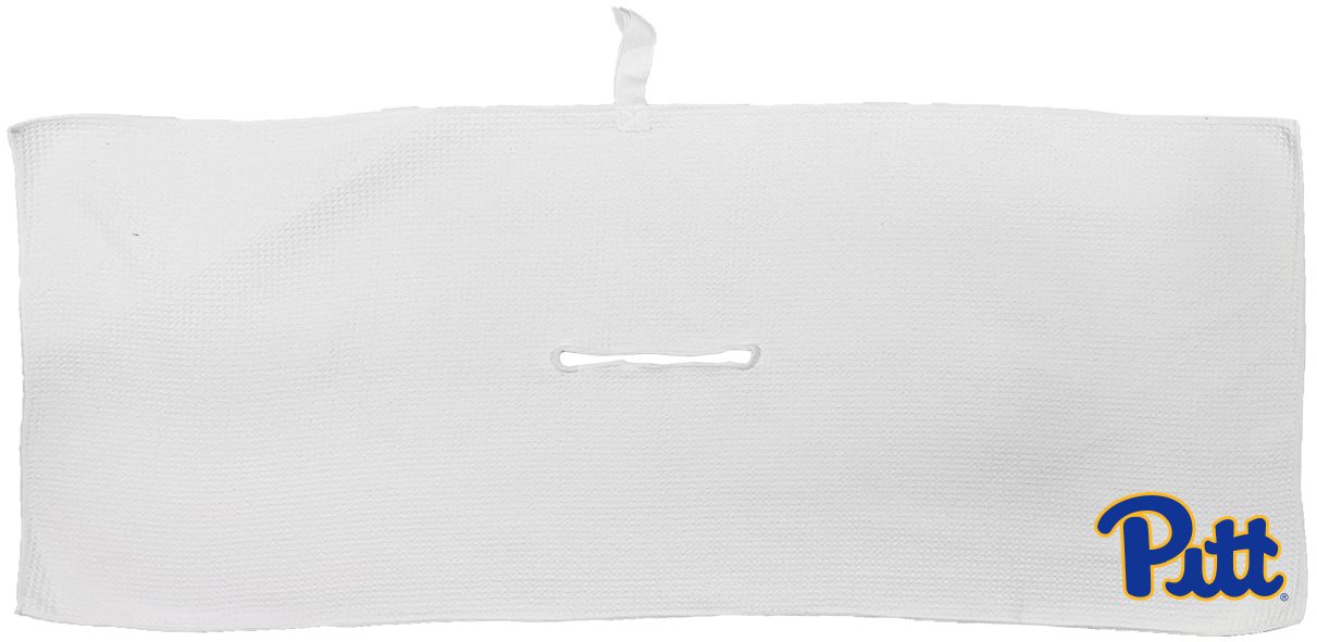 Pittsburgh Panthers Large Microfiber Towel - 16" x 40" (White) Carabiner attachment system, Measures approx. 16'' x 40'', Sublimated graphics, Center slit measures approx. 6" in diameter, Fabric loop, Material: 85% Polyester/15% Polyamide, Machine wash, tumble dry low, Officially licensed