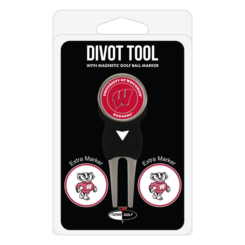 Wisconsin Badgers Divot Tool Pack - Signature tool w/ 3 markers Add some team pride to your game on the green with the Team Golf? Divot Tool and Marker Set. This set includes three double-sided, enamel magnetic markers that feature the team logo and wordmark and a nickel-finished divot tool with the team logo. The magnetic markers are easily removed from and reattach to the divot tool, making it easy to mark your ball. Support your team with this team-inspired set.