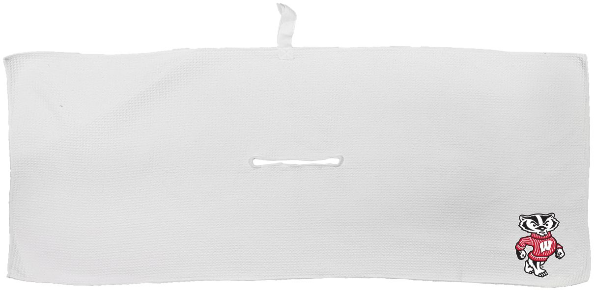 Wisconsin Badgers Large Microfiber Towel - 16" x 40" (White) Carabiner attachment system, Measures approx. 16'' x 40'', Sublimated graphics, Center slit measures approx. 6" in diameter, Fabric loop, Material: 85% Polyester/15% Polyamide, Machine wash, tumble dry low, Officially licensed