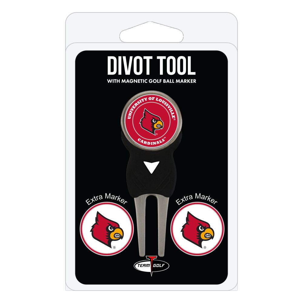 Louisville Cardinals Divot Tool Pack - Signature tool w/ 3 markers Add some team pride to your game on the green with the Team Golf? Divot Tool and Marker Set. This set includes three double-sided, enamel magnetic markers that feature the team logo and wordmark and a nickel-finished divot tool with the team logo. The magnetic markers are easily removed from and reattach to the divot tool, making it easy to mark your ball. Support your team with this team-inspired set.
