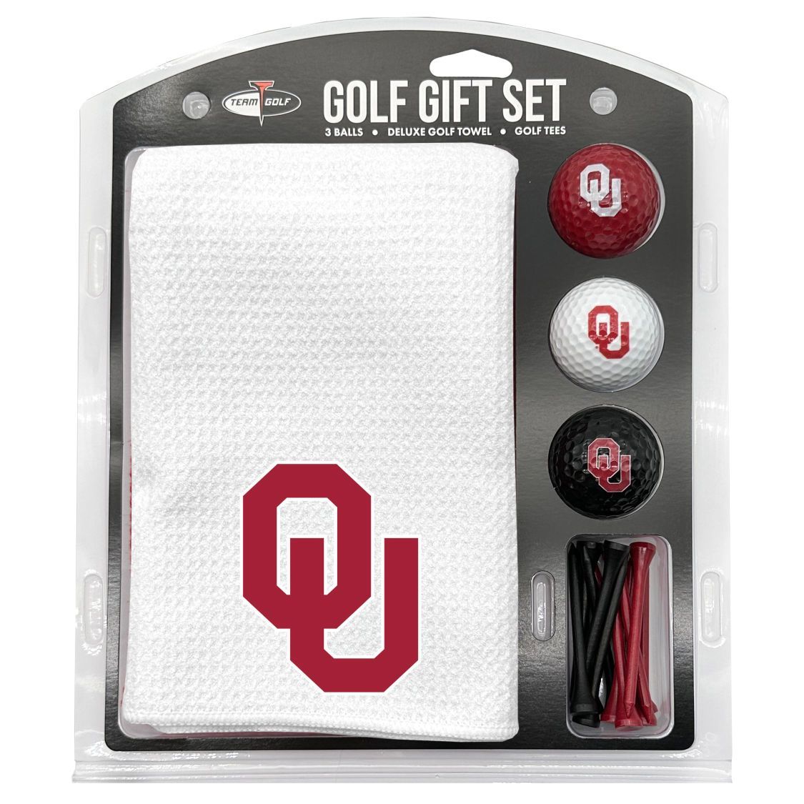 Oklahoma Sooners Microfiber Towel Gift Set - 16 x 40 (White) 16” x 40” printed logo towel, 3 different color golf balls, 12 golf tees, High quality digital print