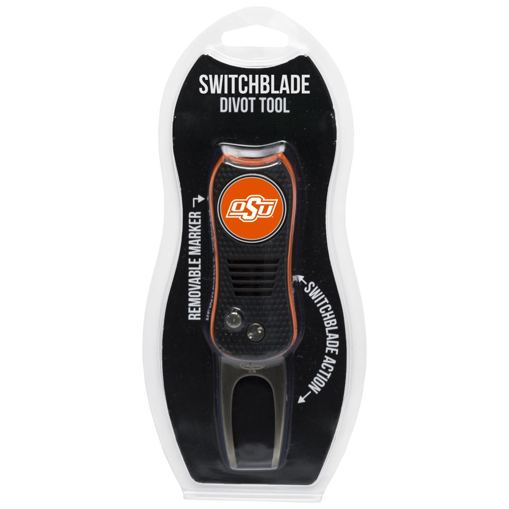 Oklahoma State Cowboys Switchblade Divot Tool Pack Ball marker measures approx. 1'' in diameter, Divot tool measures approx. 2.8'' in height when closed; 4.5'' when open, Printed graphics with enamel overlay, Soft-touch rubberized grip, Switchblade function with button release, Magnetic ball marker, Material: 100% Plastic - Base; 100% Metal - Divot Tool & Marker