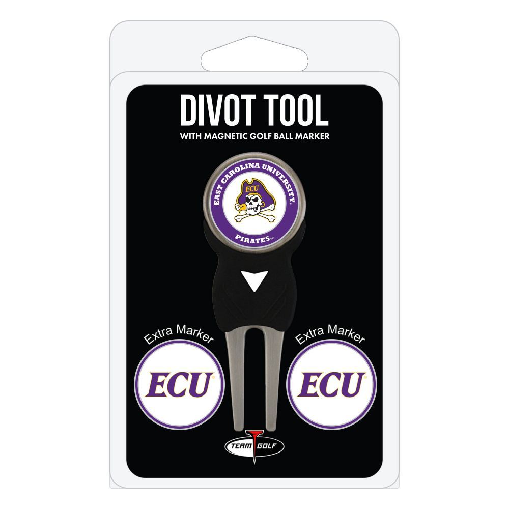 East Carolina Pirates Divot Tool Pack - Signature tool w/ 3 markers Add some team pride to your game on the green with the Team Golf? Divot Tool and Marker Set. This set includes three double-sided, enamel magnetic markers that feature the team logo and wordmark and a nickel-finished divot tool with the team logo. The magnetic markers are easily removed from and reattach to the divot tool, making it easy to mark your ball. Support your team with this team-inspired set.