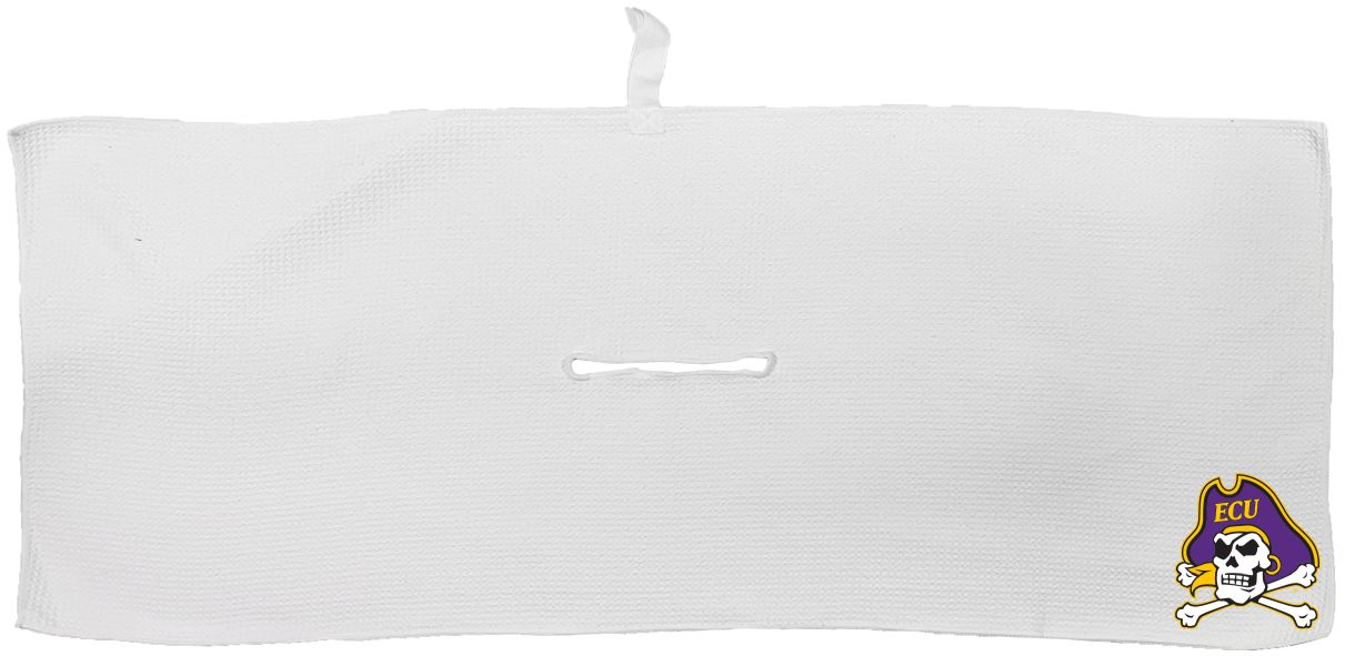 East Carolina Pirates Large Microfiber Towel - 16" x 40" (White) Carabiner attachment system, Measures approx. 16'' x 40'', Sublimated graphics, Center slit measures approx. 6" in diameter, Fabric loop, Material: 85% Polyester/15% Polyamide, Machine wash, tumble dry low, Officially licensed
