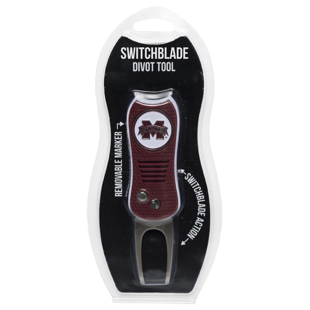 Mississippi State Bulldogs Switchblade Divot Tool Pack Ball marker measures approx. 1'' in diameter, Divot tool measures approx. 2.8'' in height when closed; 4.5'' when open, Printed graphics with enamel overlay, Soft-touch rubberized grip, Switchblade function with button release, Magnetic ball marker, Material: 100% Plastic - Base; 100% Metal - Divot Tool & Marker