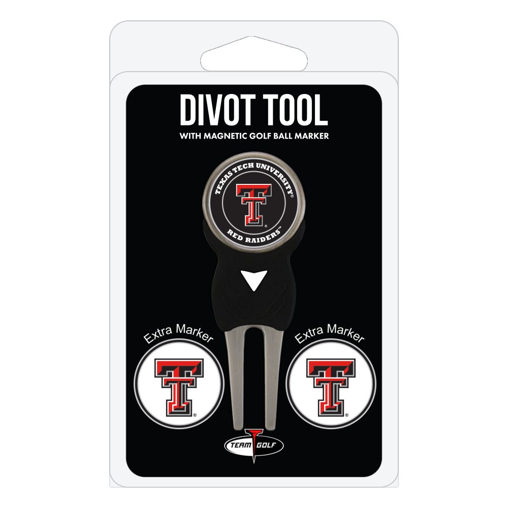 Texas Tech Red Raiders Divot Tool Pack - Signature tool w/ 3 markers Add some team pride to your game on the green with the Team Golf? Divot Tool and Marker Set. This set includes three double-sided, enamel magnetic markers that feature the team logo and wordmark and a nickel-finished divot tool with the team logo. The magnetic markers are easily removed from and reattach to the divot tool, making it easy to mark your ball. Support your team with this team-inspired set.