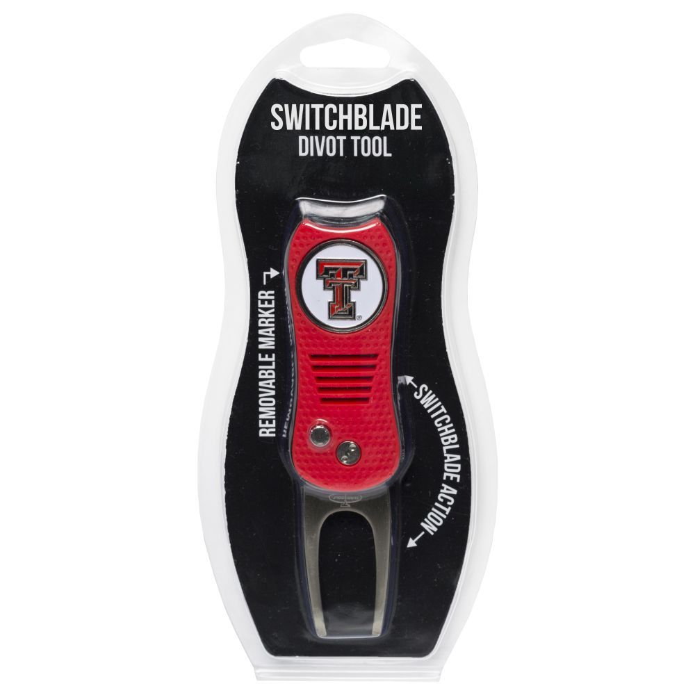 Texas Tech Red Raiders Switchblade Divot Tool Pack Ball marker measures approx. 1'' in diameter, Divot tool measures approx. 2.8'' in height when closed; 4.5'' when open, Printed graphics with enamel overlay, Soft-touch rubberized grip, Switchblade function with button release, Magnetic ball marker, Material: 100% Plastic - Base; 100% Metal - Divot Tool & Marker