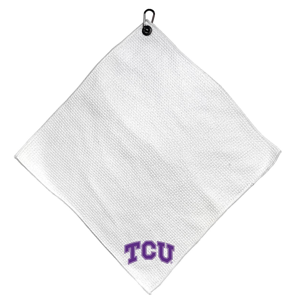 TCU Horned Frogs Microfiber Small Towel - 15" x 15" (White) Carabiner attached, Measures approx. 15" x 15", Cleans without scratching club surface, Printed graphics, Material: 85% Polyester/15% Polyamide, Woven waffle fabric, Machine wash, tumble dry low, Officially licensed