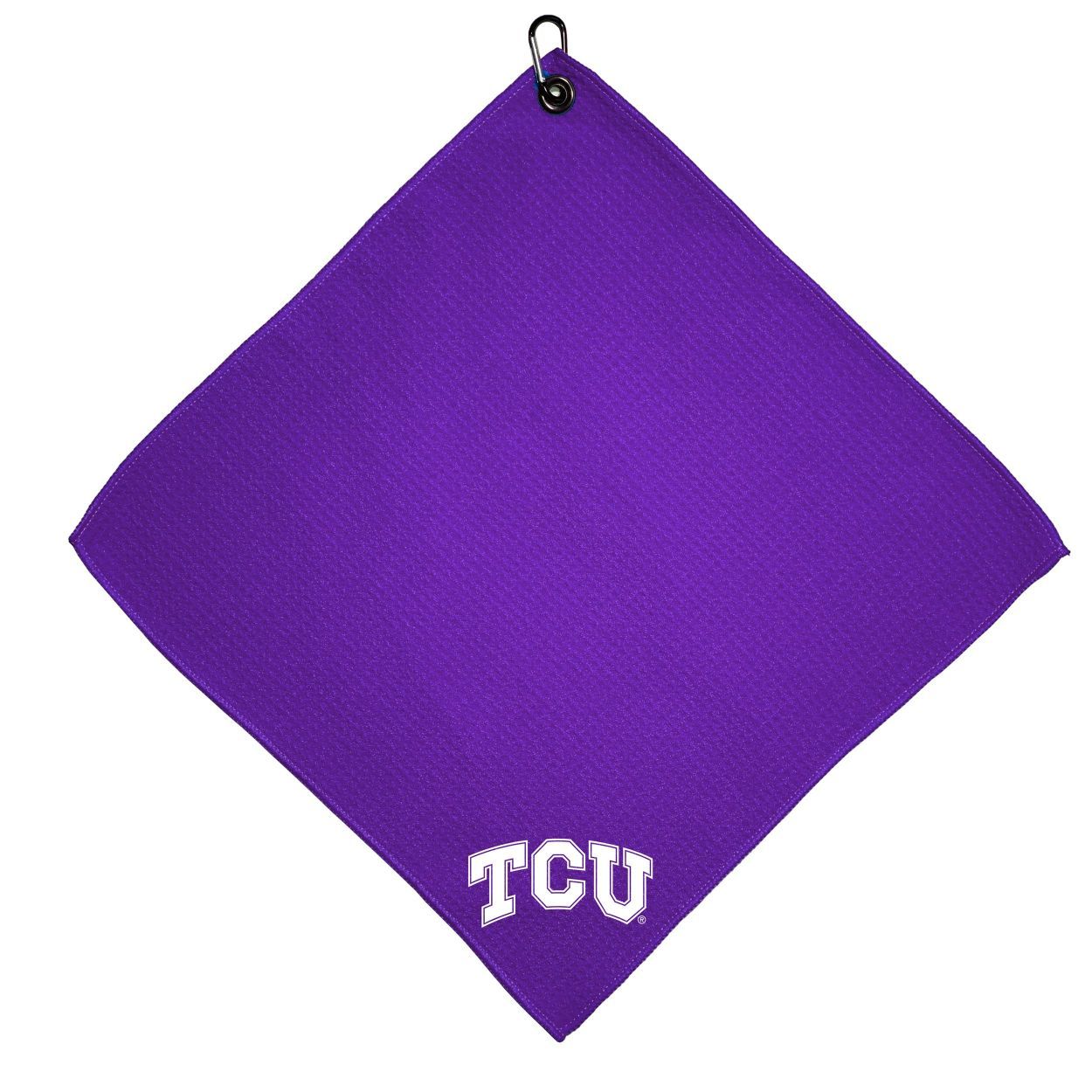TCU Horned Frogs Microfiber Towel - 15" x 15" (Colored) Carabiner attached, Measures approx. 15" x 15", Cleans without scratching club surface, Printed graphics, Material: 85% Polyester/15% Polyamide, Woven waffle fabric, Machine wash, tumble dry low, Officially licensed