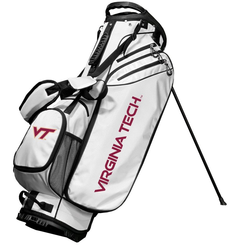 Virginia Tech Hokies Birdie Golf Stand Bag White - White 4-way full length dividers, Two lift assist handles, Six Zippered pockets, Cooler pocket, Padded shoulder strap, Screen print graphics, Fleece-lined valuables pouch, Integrated top handle, Measures approximately 36" x 15" x , Towel ring, Umbrella holder, Kick stand, Glove holder, Material: 60% Nylon/40% Plasti, Officially licensed