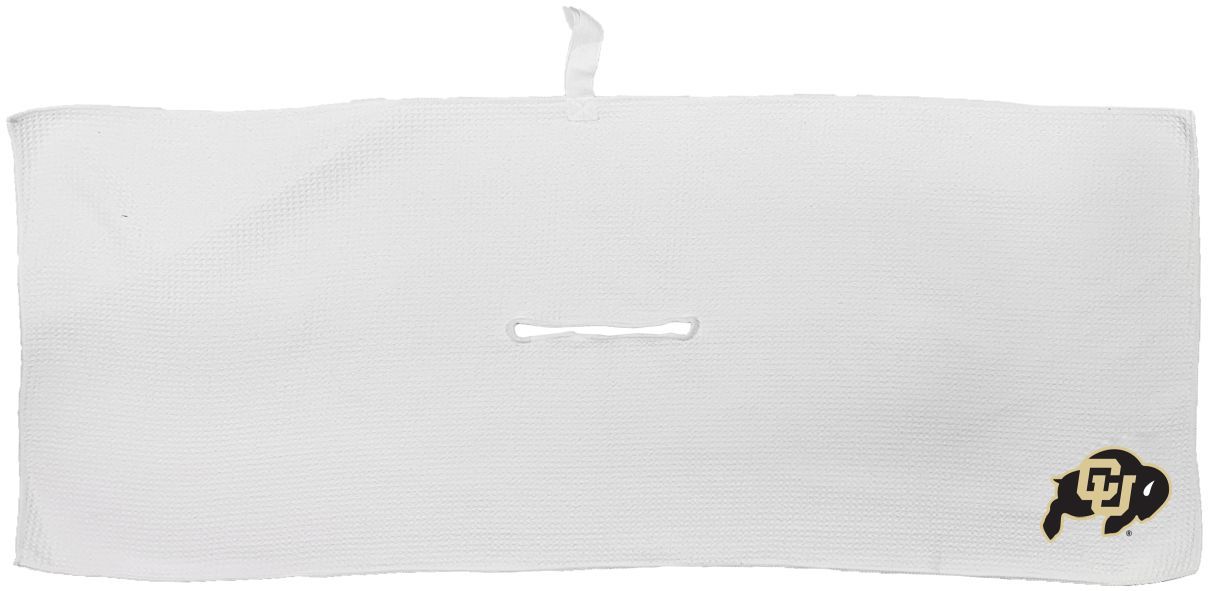 Colorado Buffaloes Large Microfiber Towel - 16" x 40" (White) Carabiner attachment system, Measures approx. 16'' x 40'', Sublimated graphics, Center slit measures approx. 6" in diameter, Fabric loop, Material: 85% Polyester/15% Polyamide, Machine wash, tumble dry low, Officially licensed