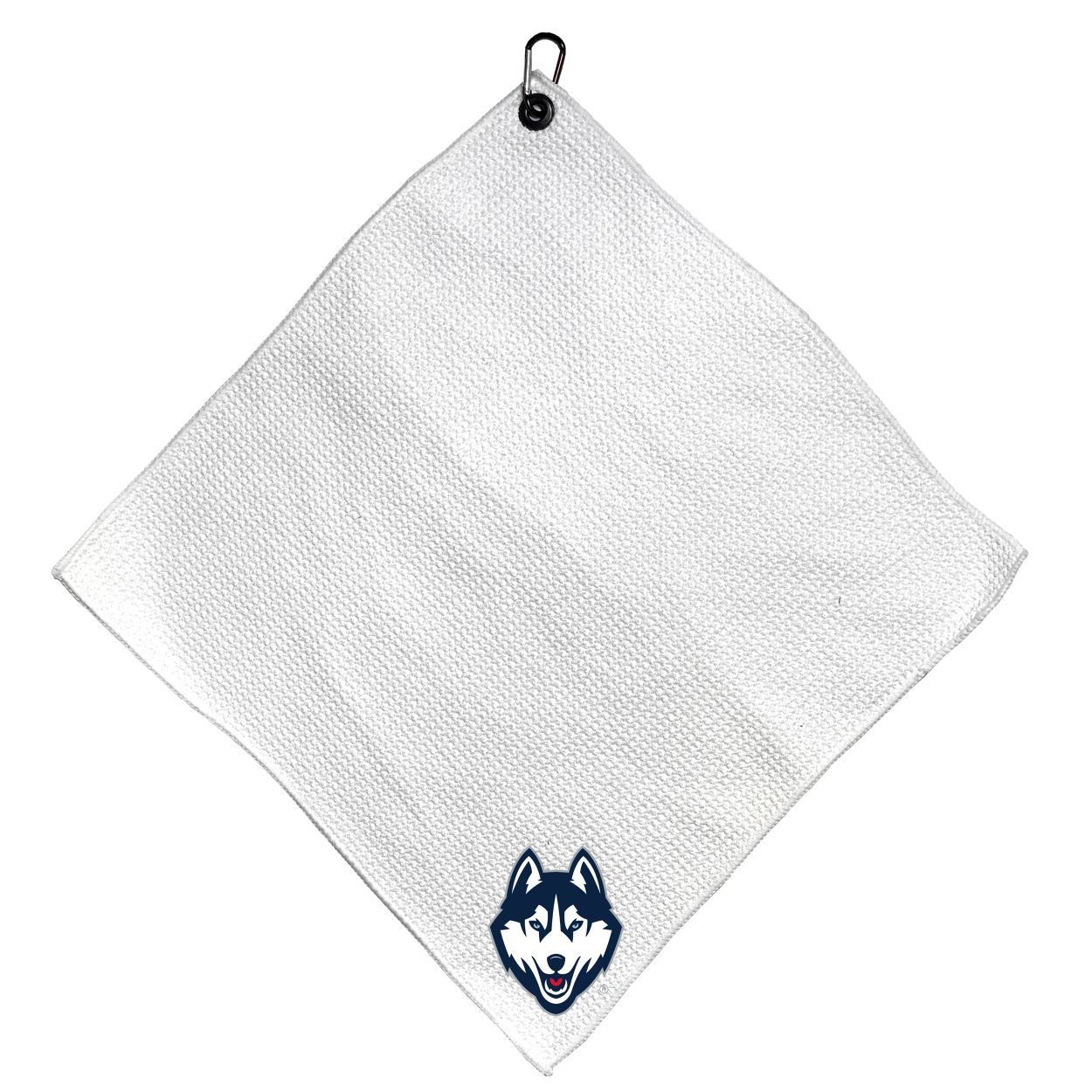 Connecticut Huskies Microfiber Small Towel - 15" x 15" (White) Carabiner attached, Measures approx. 15" x 15", Cleans without scratching club surface, Printed graphics, Material: 85% Polyester/15% Polyamide, Woven waffle fabric, Machine wash, tumble dry low, Officially licensed