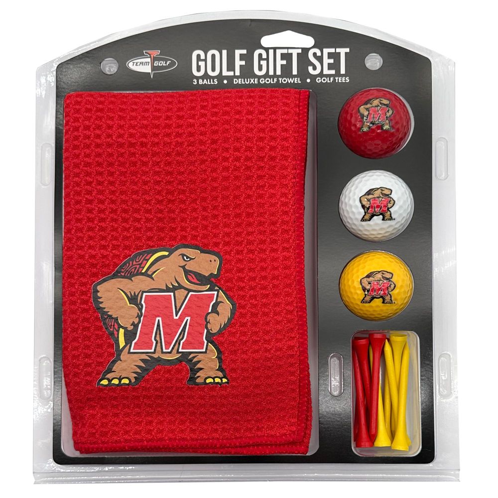 Maryland Terrapins Microfiber Towel Gift Set - 16 x 40 (Colored) 16” x 40” printed logo towel, 3 different color golf balls, 12 golf tees, High quality digital print