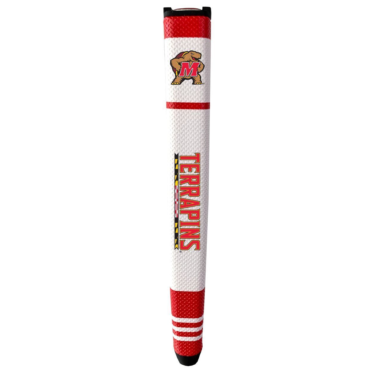 Maryland Terrapins Putter Grip (White with colored stripes) Durable rubber construction, Measures approx. 12.5" x 3.5" x 2", Printed graphics, Soft polyurethane surface, Includes removable ball marker, Debossed design, Material: 85% Rubber/15% PVC