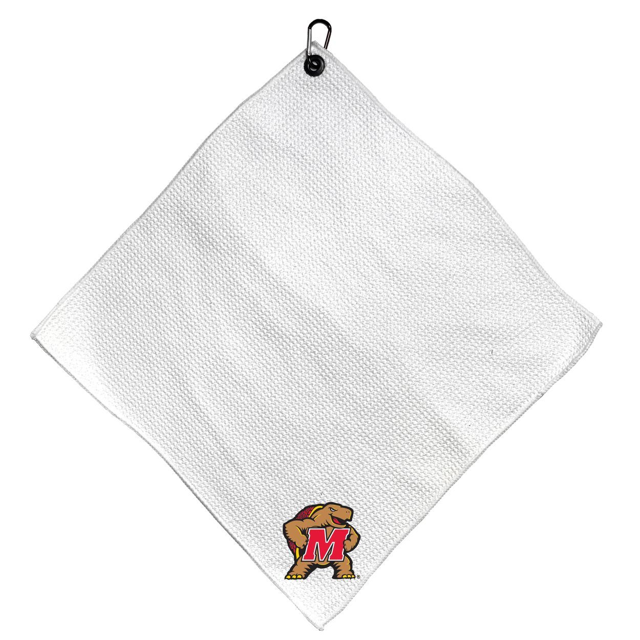 Maryland Terrapins Microfiber Small Towel - 15" x 15" (White) Carabiner attached, Measures approx. 15" x 15", Cleans without scratching club surface, Printed graphics, Material: 85% Polyester/15% Polyamide, Woven waffle fabric, Machine wash, tumble dry low, Officially licensed