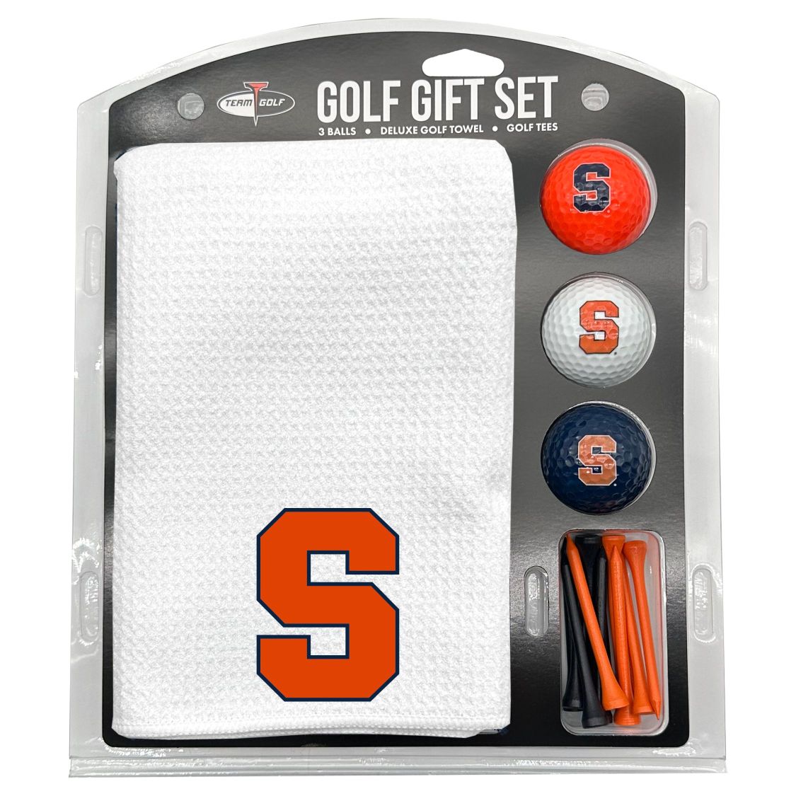 Syracuse Orange Microfiber Towel Gift Set - 16 x 40 (White) 16” x 40” printed logo towel, 3 different color golf balls, 12 golf tees, High quality digital print