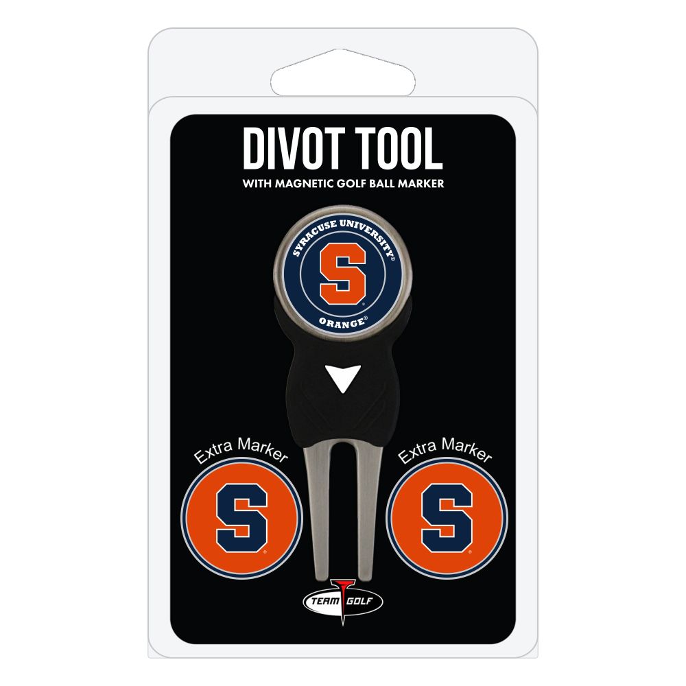 Syracuse Orange Divot Tool Pack - Signature tool w/ 3 markers Add some team pride to your game on the green with the Team Golf? Divot Tool and Marker Set. This set includes three double-sided, enamel magnetic markers that feature the team logo and wordmark and a nickel-finished divot tool with the team logo. The magnetic markers are easily removed from and reattach to the divot tool, making it easy to mark your ball. Support your team with this team-inspired set.