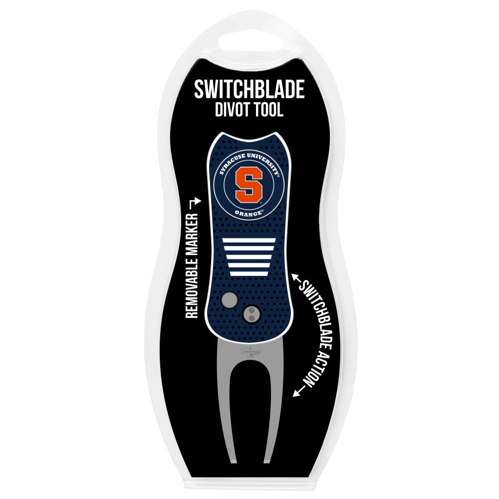Syracuse Orange Switchblade Divot Tool Pack Ball marker measures approx. 1'' in diameter, Divot tool measures approx. 2.8'' in height when closed; 4.5'' when open, Printed graphics with enamel overlay, Soft-touch rubberized grip, Switchblade function with button release, Magnetic ball marker, Material: 100% Plastic - Base; 100% Metal - Divot Tool & Marker