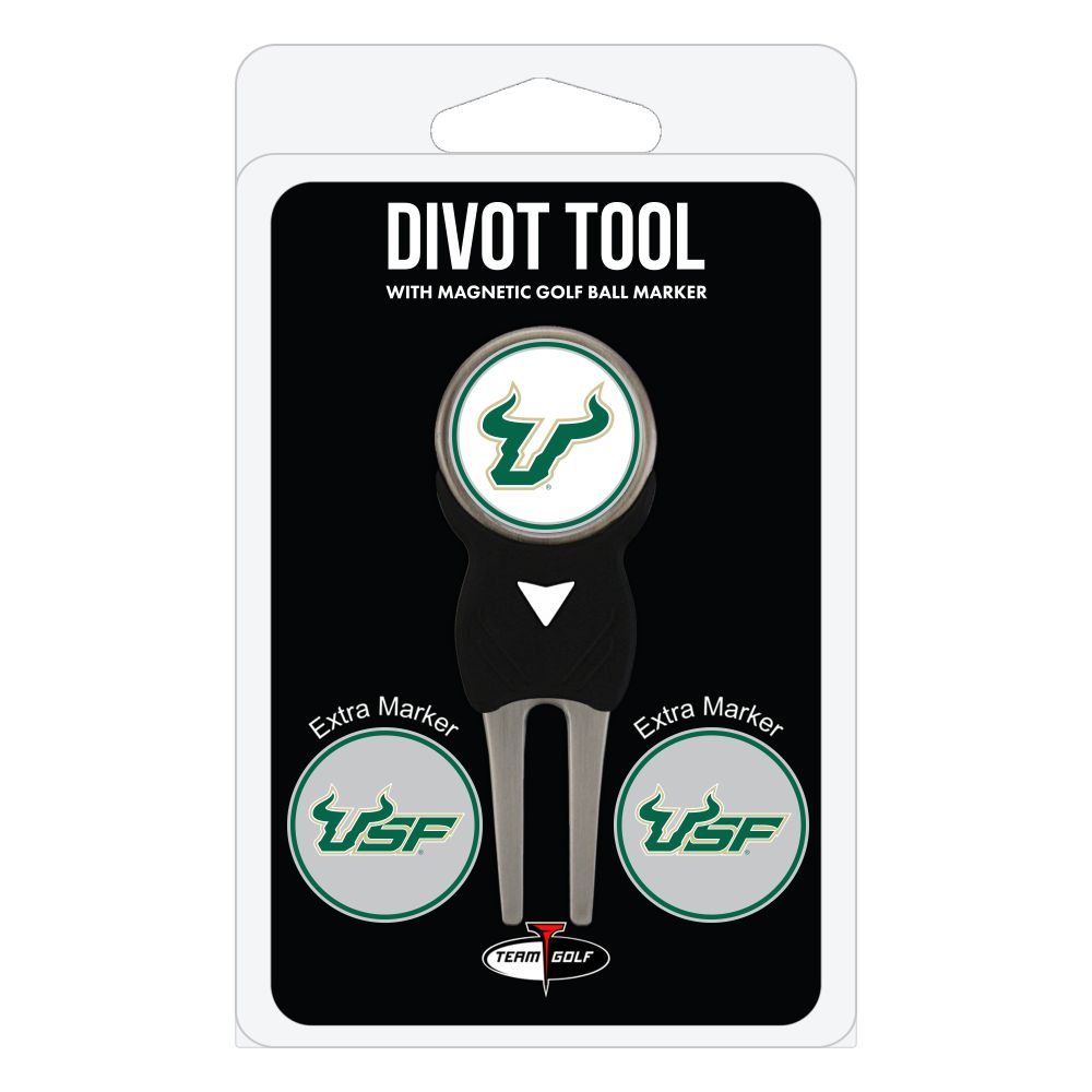 South Florida Bulls Divot Tool Pack - Signature tool w/ 3 markers Add some team pride to your game on the green with the Team Golf? Divot Tool and Marker Set. This set includes three double-sided, enamel magnetic markers that feature the team logo and wordmark and a nickel-finished divot tool with the team logo. The magnetic markers are easily removed from and reattach to the divot tool, making it easy to mark your ball. Support your team with this team-inspired set.