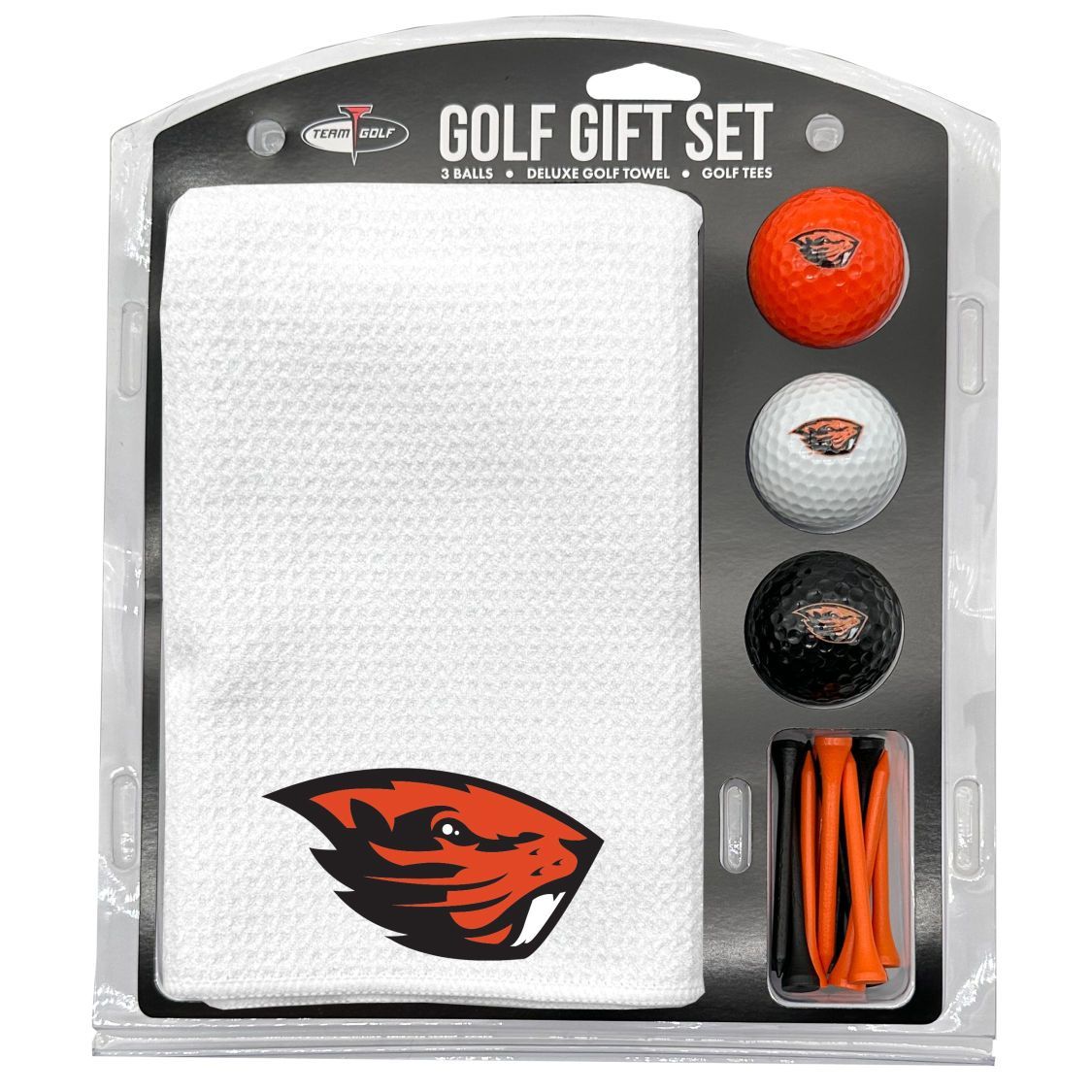 Oregon State Beavers Microfiber Towel Gift Set - 16 x 40 (White) 16” x 40” printed logo towel, 3 different color golf balls, 12 golf tees, High quality digital print