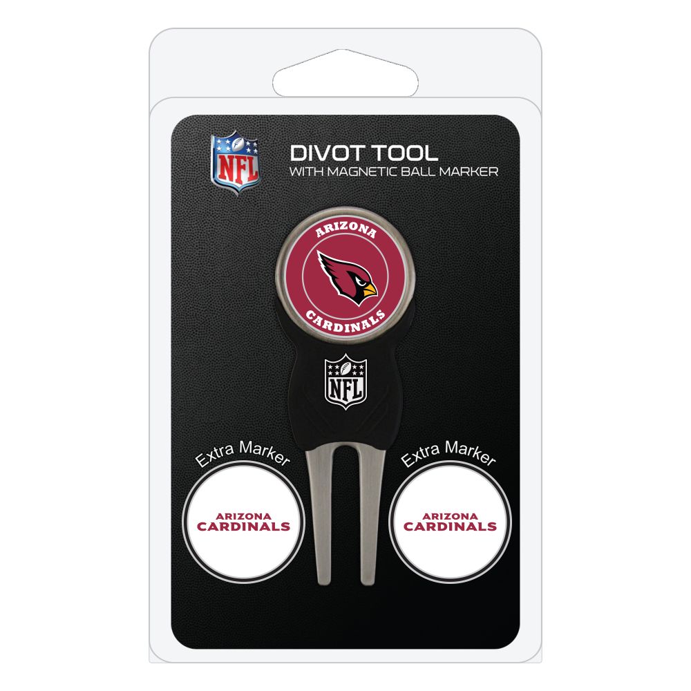 Arizona Cardinals Divot Tool Pack - Signature tool w/ 3 markers Add some team pride to your game on the green with the Team Golf? Divot Tool and Marker Set. This set includes three double-sided, enamel magnetic markers that feature the team logo and wordmark and a nickel-finished divot tool with the team logo. The magnetic markers are easily removed from and reattach to the divot tool, making it easy to mark your ball. Support your team with this team-inspired set.