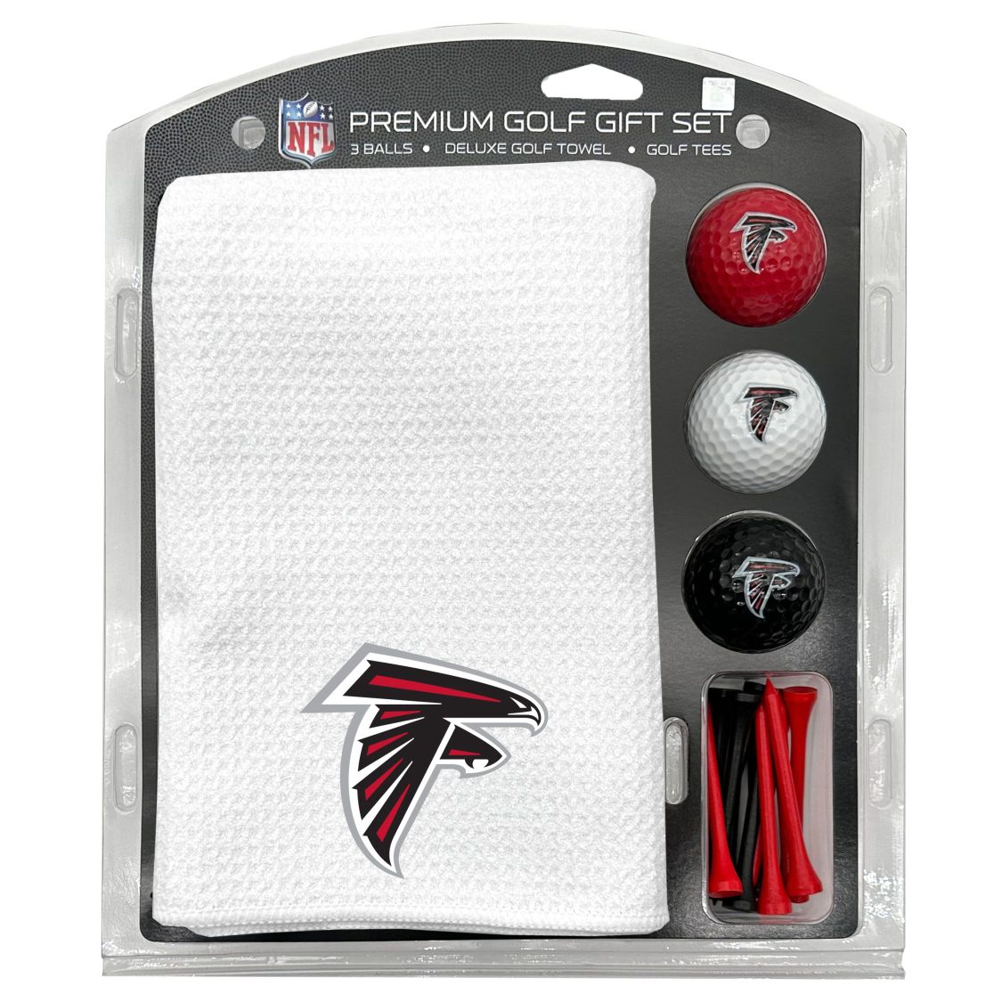Atlanta Falcons Microfiber Towel Gift Set - 16 x 40 (White) 16” x 40” printed logo towel, 3 different color golf balls, 12 golf tees, High quality digital print