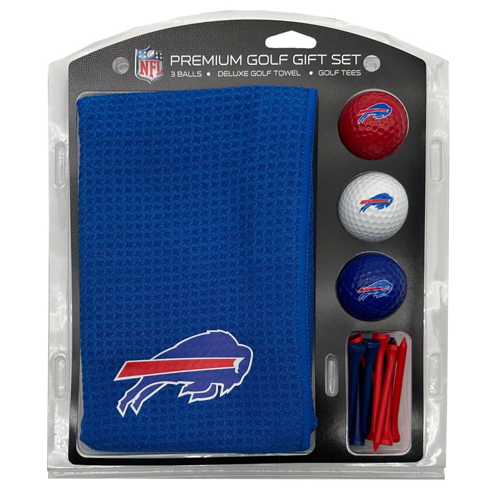 Buffalo Bills Microfiber Towel Gift Set - 16 x 40 (Colored) 16” x 40” printed logo towel, 3 different color golf balls, 12 golf tees, High quality digital print