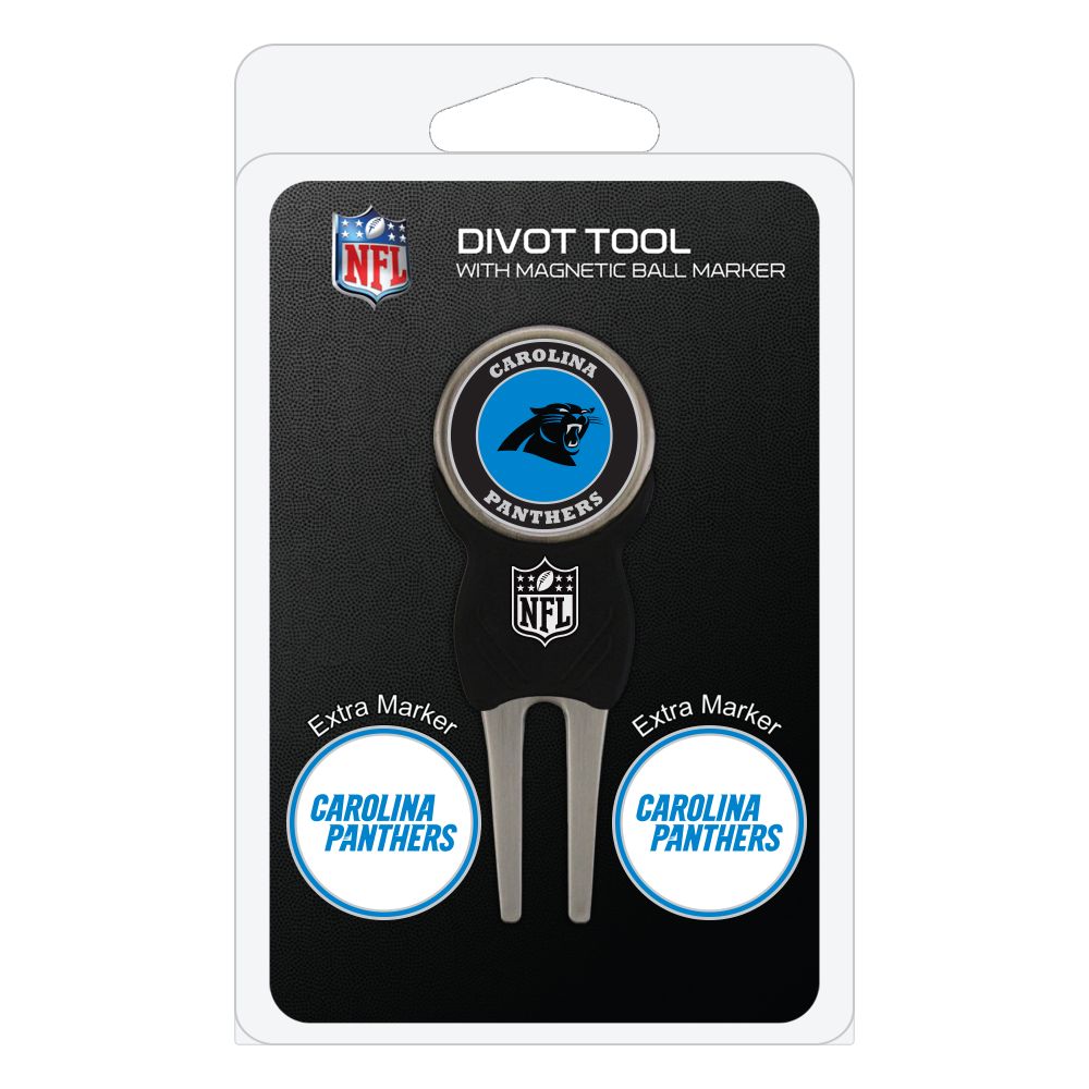 Carolina Panthers Divot Tool Pack - Signature tool w/ 3 markers Add some team pride to your game on the green with the Team Golf? Divot Tool and Marker Set. This set includes three double-sided, enamel magnetic markers that feature the team logo and wordmark and a nickel-finished divot tool with the team logo. The magnetic markers are easily removed from and reattach to the divot tool, making it easy to mark your ball. Support your team with this team-inspired set.